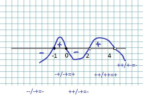 нанесем на числовую ось значения х которые обращают в о числитель и знаменатель {-1,0,2,4} и определим знаки выражения на интервалах