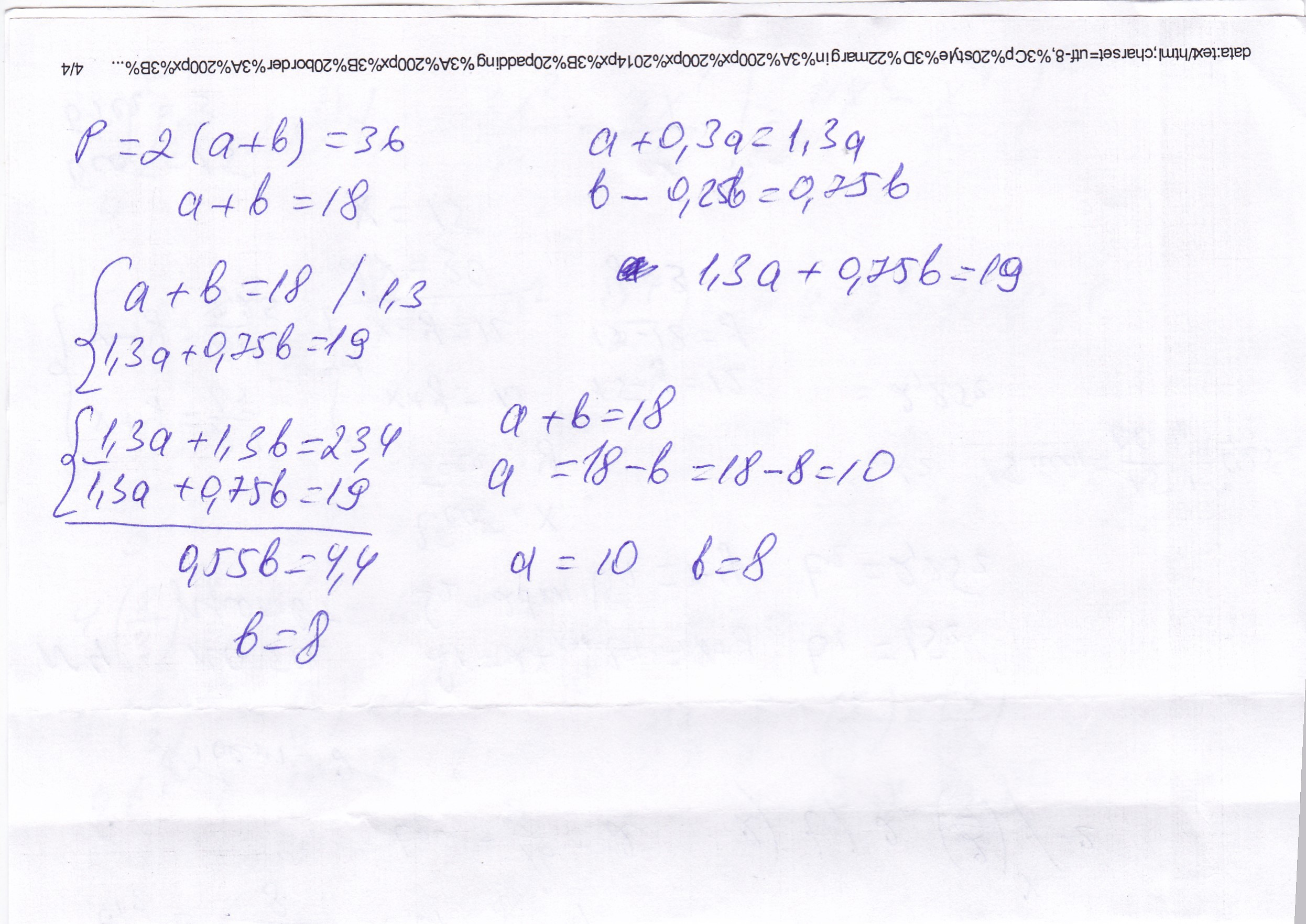 Периметр многоугольника равен 36 см.Если его длину увеличить на 30%, а ширину уменьшить на 25%, то периметр будет равен 38 см. Найдите первоначальную длину и ширину прямоугольника.