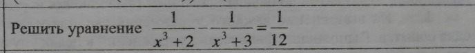 frac{1}{x^3+2} - frac{1}{x^3+3} = frac{1}{12} ; ,; ; ODZ:; xne -sqrt[3]2; ;; xne -sqrt[3]3\\ frac{1}{x^3+2} - frac{1}{x^3+3} - frac{1}{12} =0\\ frac{12(x^3+3)-12(x^3+2)-(x^3+2)(x^3+3)}{12(x^3+2)(x^3+3)} =0\\ frac{-(x^6+5x^3+6)}{12(x^3+2)(x^3+3)}=0 \\ frac{(x^3+2)(x^3+3)}{12(x^3+2)(x^3+3)}=0; ; Rightarrow ; ; frac{1}{12}=0; ; net ; ; reshenij\\xin varnothing