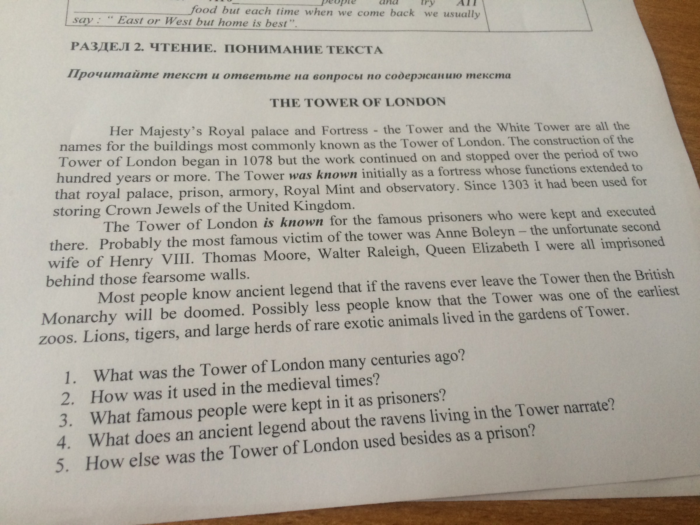Many centuries ago the Tower of London was a fortress,a prison, an armory, a Royal Mint and an observatory. In medieval times the Tower had been used for storing Crown Jewels of the UK. The most famous victims of the Tower were:Ann Boleyn, Thomas Moore, Queen Elizabeth l. If the ravens ever leave the Tower, the British Monarchy will be doomed. The Tower was also used as a Zoo.