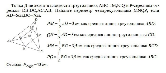 Точка Д не лежит в плоскости треугольника ABC . M,N,Q и P-середины отрезков DB,DC,AC,AB. Найдите периметр четырехугольника MNQP,если AD=6см,BC=7см