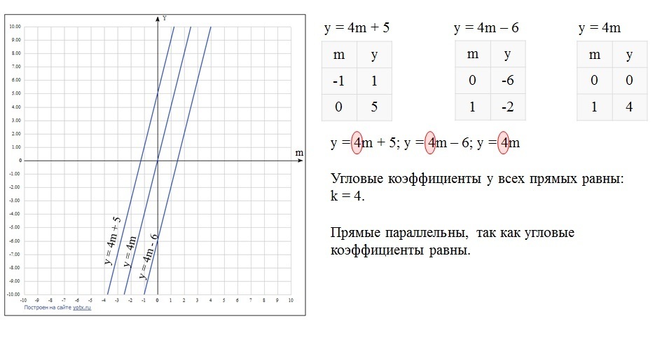 постройте на одной координатной плоскости графики функций: y=4m+5 ; y=4m-6 ; y=4m 1) НАЙДИТЕ УГЛОВОЙ КОЭФФИЦИЕНТ ПРЯМЫХ 2)КАКОВО ВЗАИМНОЕ РАСПОЛОЖЕНИЕ ПРЯМЫХ ?
