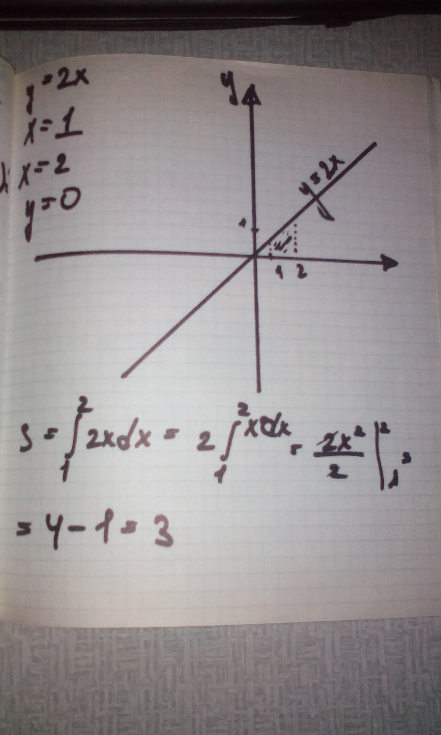 получится интеграл, верхний предел 2, нижний 1. под интегралом 2xdx. Раскрывает интеграл получается 4-1=3