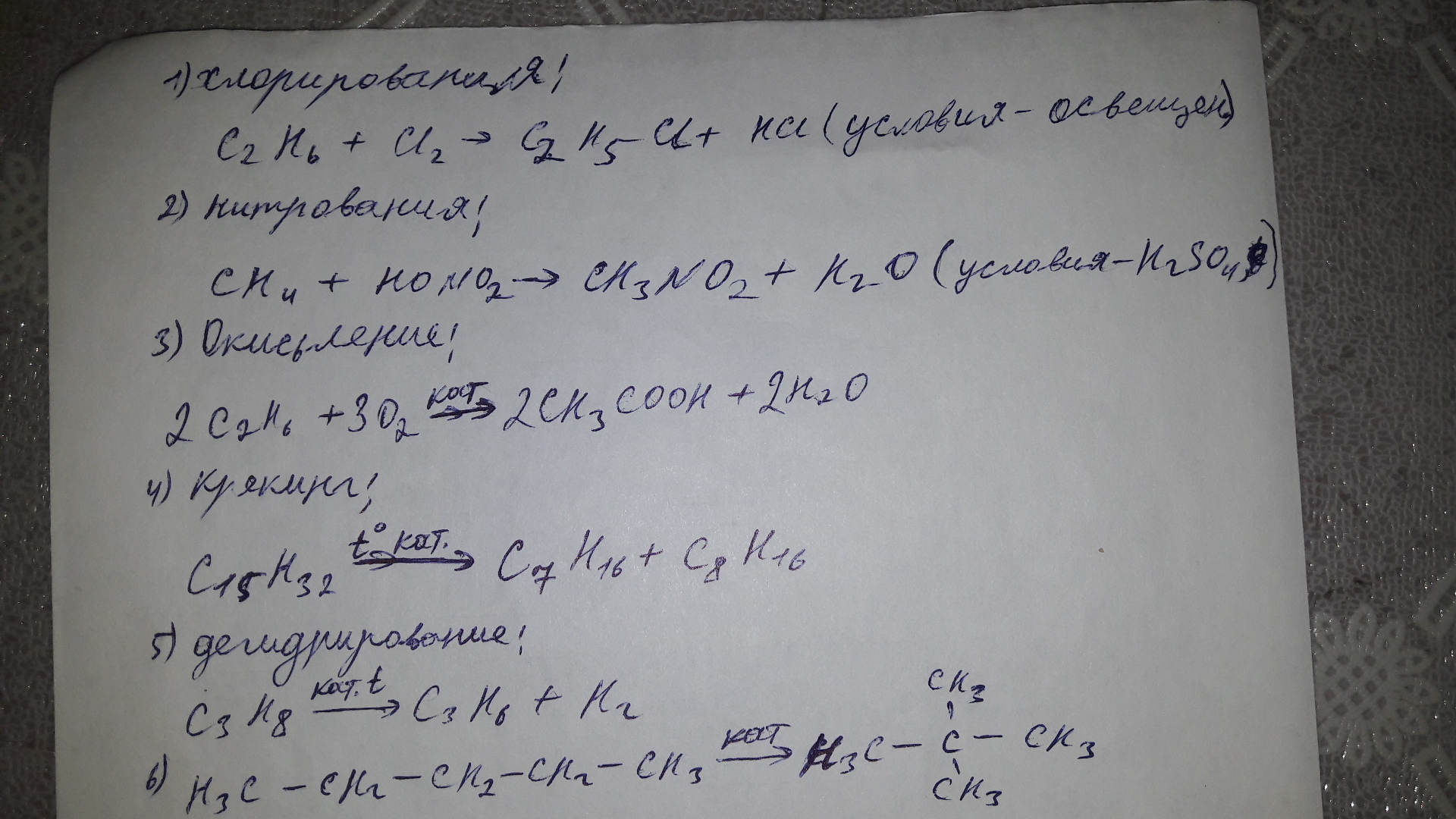 Напишите уравнения реакции химических свойств алканов: хлорирование, нитрование, окисление, крекинг, дегидрирование, изомеризация.