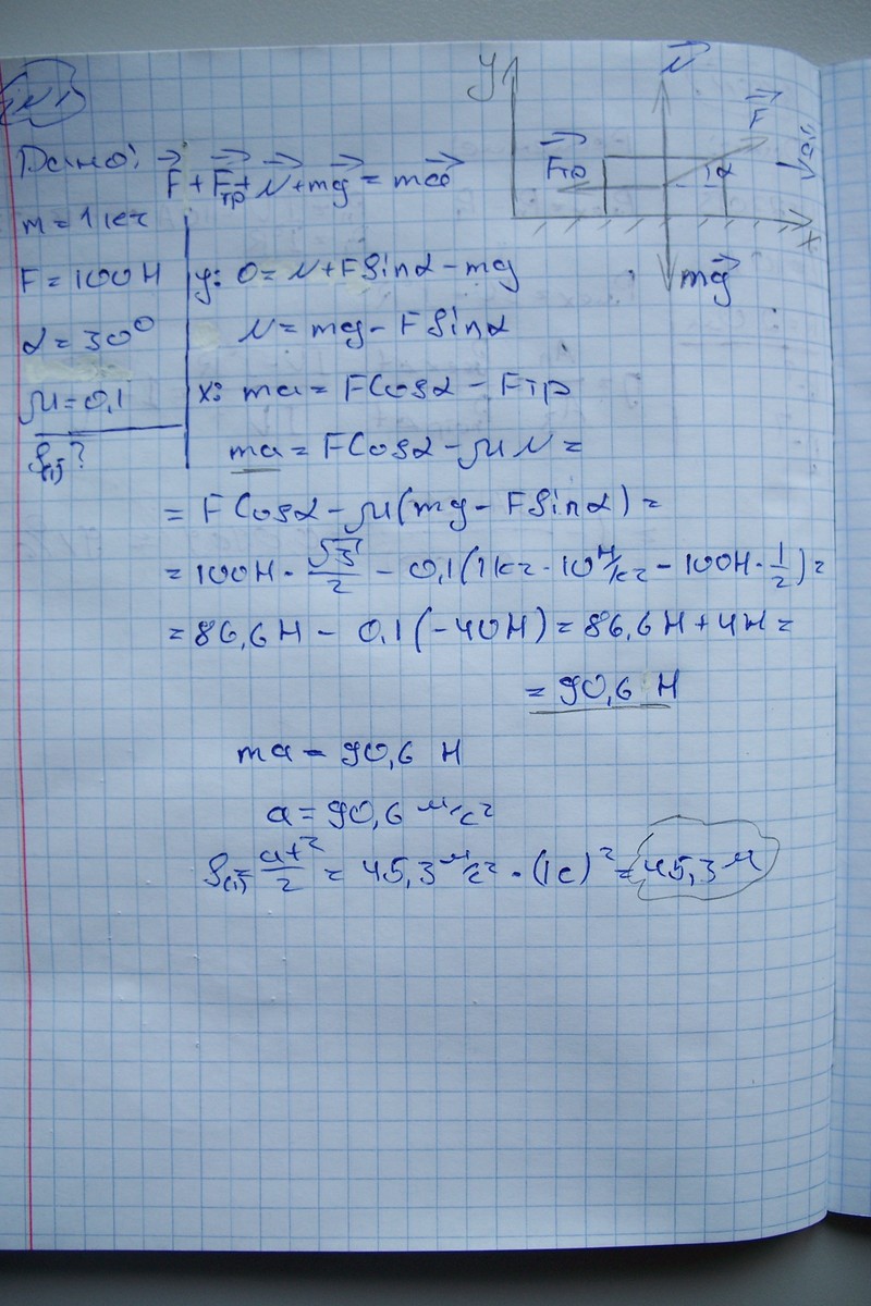 1.На тело массой 1 кг, лежащее на горизонтальной поверхности, начинает действовать сила 100 Н, направленная вверх под углом 30° к горизонту. Какой путь пройдет тело по горизонтальной поверхности за 1 секунду? Коэффициент трения тела о поверхность равен 0,1.