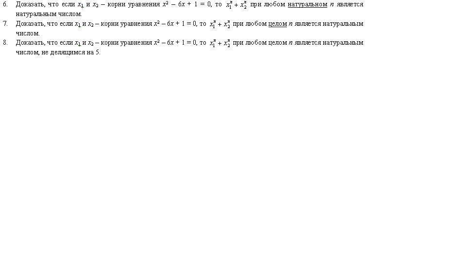 Если n натуральное, а f(1)=6, f(2)=(x1+x2)^2-2*x1*x2=6^2-2*1=34 тоже натуральные, то f(3) и выше являются целыми числами, исходя из того, что f(n) получается из рекуррентной зависимости с целыми коэффициентами. Последовательность возрастающая, так как f(2)-f(1)>0 (начальное условие), f(n)=5*f(n-1) + f(n-1)-f(n-2) > f(n-1). Поэтому при натуральных n последовательность не только целая, но еще и натуральная.