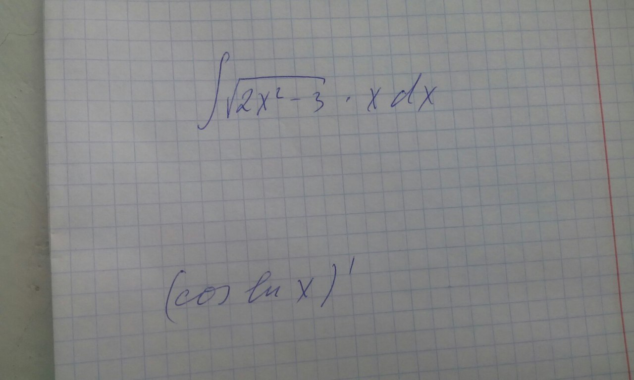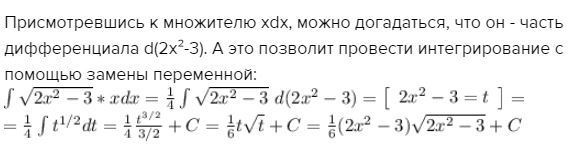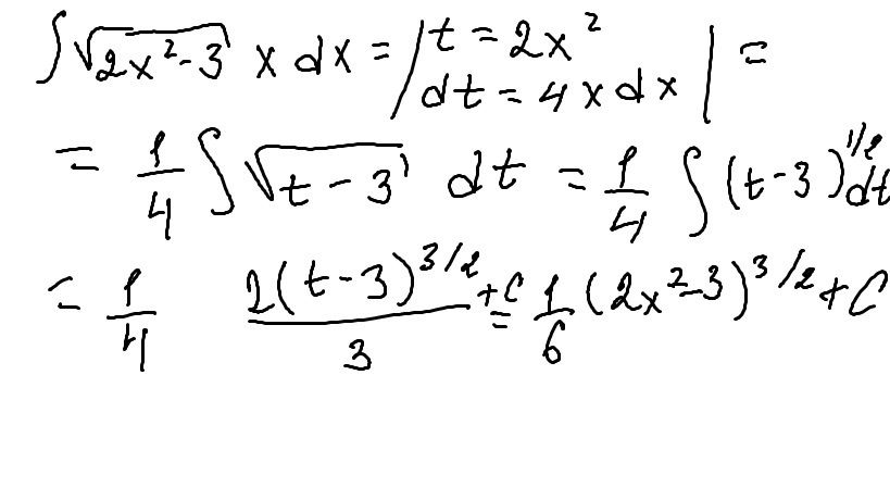![int sqrt{2x^2 -3}*xdx= frac{1}{4} int sqrt{2x^2 -3} d(2x^2 -3) = left[begin{array}{c} 2x^2 -3=tend{array}right] =\ = frac{1}{4} int t^{1/2}dt= frac{1}{4} frac{t^{3/2}}{3/2} +C= frac{1}{6}t sqrt{t} +C= frac{1}{6}(2x^2 -3) sqrt{2x^2 -3} +C int sqrt{2x^2 -3}*xdx= frac{1}{4} int sqrt{2x^2 -3} d(2x^2 -3) = left[begin{array}{c} 2x^2 -3=tend{array}right] =\ = frac{1}{4} int t^{1/2}dt= frac{1}{4} frac{t^{3/2}}{3/2} +C= frac{1}{6}t sqrt{t} +C= frac{1}{6}(2x^2 -3) sqrt{2x^2 -3} +C](https://tex.z-dn.net/?f=int++sqrt%7B2x%5E2+-3%7D%2Axdx%3D+frac%7B1%7D%7B4%7D+int++sqrt%7B2x%5E2+-3%7D+d%282x%5E2+-3%29+%3D+++left%5Bbegin%7Barray%7D%7Bc%7D+2x%5E2+-3%3Dtend%7Barray%7Dright%5D+%3D%5C+%3D++frac%7B1%7D%7B4%7D+int+t%5E%7B1%2F2%7Ddt%3D++frac%7B1%7D%7B4%7D++frac%7Bt%5E%7B3%2F2%7D%7D%7B3%2F2%7D+%2BC%3D+frac%7B1%7D%7B6%7Dt+sqrt%7Bt%7D++%2BC%3D+frac%7B1%7D%7B6%7D%282x%5E2+-3%29+sqrt%7B2x%5E2+-3%7D++%2BC)