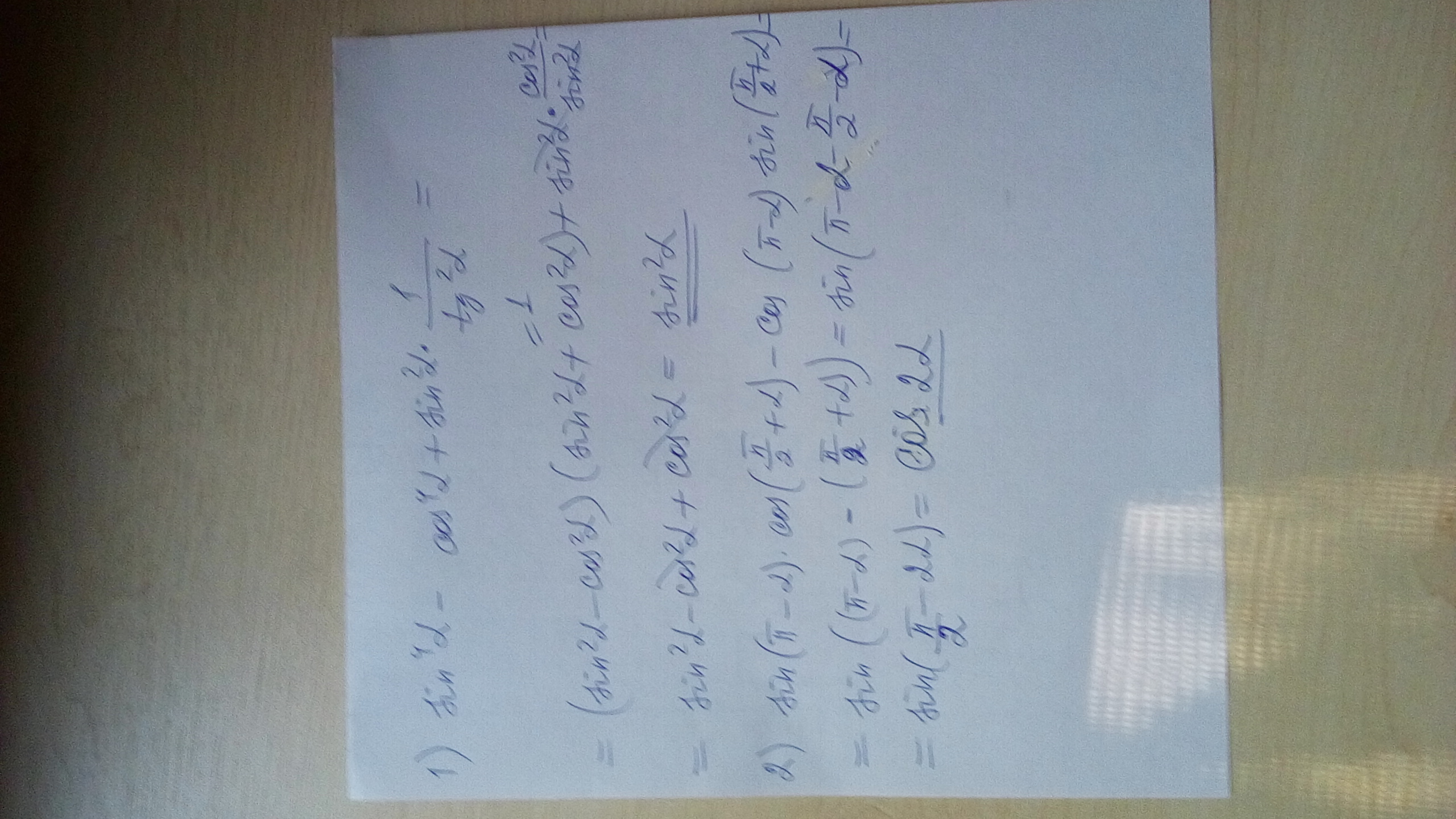 Помогите решить sin^4(а) -cos^4(a)+sin^2(a)*1/tg^2(a) и sin(Pi-a)*cos(Pi/2+a)-cos(Pi-a)*sin(Pi/2+a). Заранее спасибо!