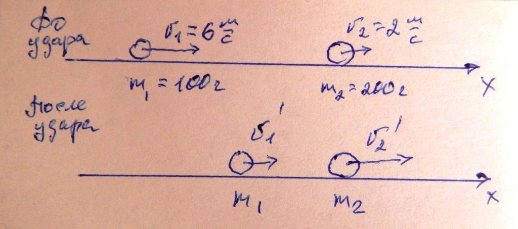 Шар массой 100 г , двигаясь со скоростью 6 м/c, догоняет другой шар , массой 200 г , движущийся в том же направлении со скоростью 2 м/c.Найдите скорости шаров после упругого удара,если скорость второго шара увеличилась в два раза.