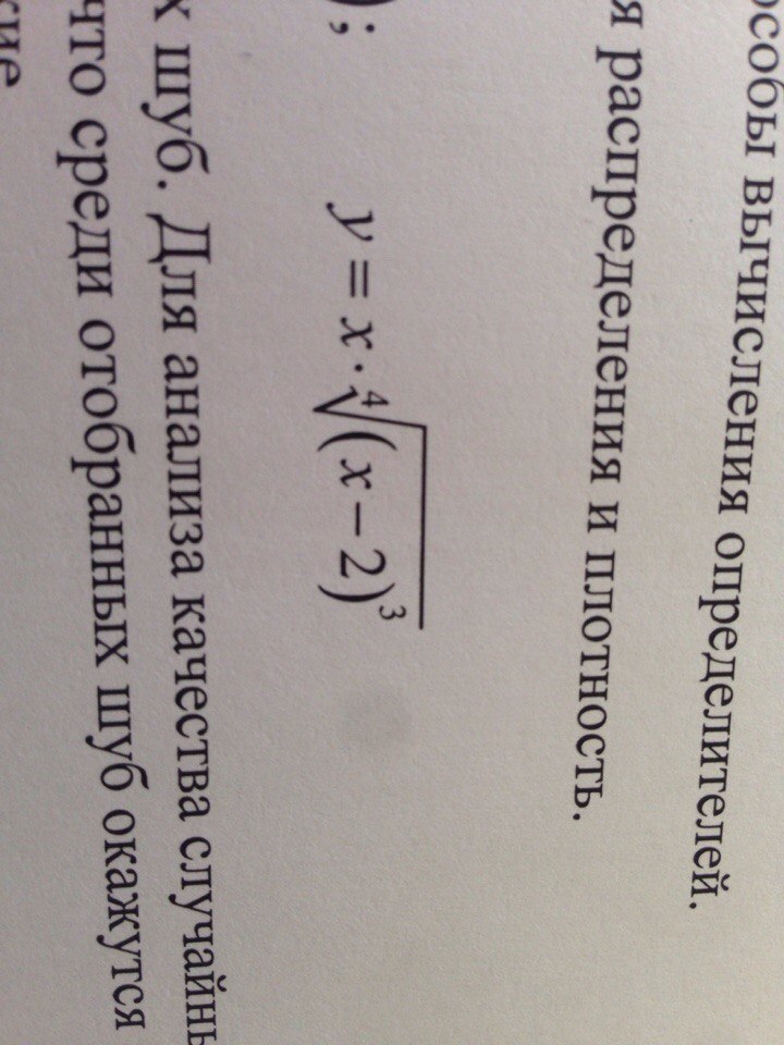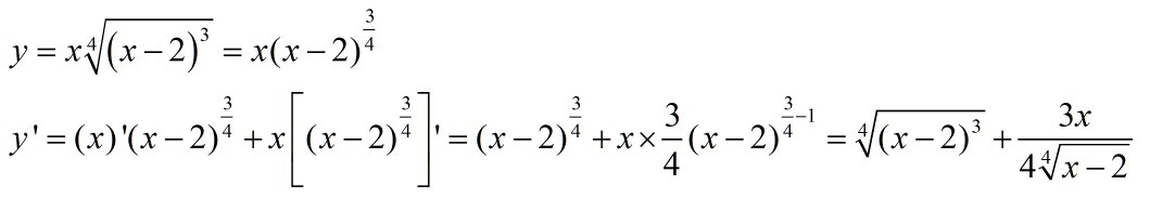 y`=(x*(x-2)³/⁴)`=x`*(x-2)³/⁴+(x*(x-2)³/⁴)`=(x-2)³/⁴+x*(3/4)*(x-2)⁻¹/⁴=