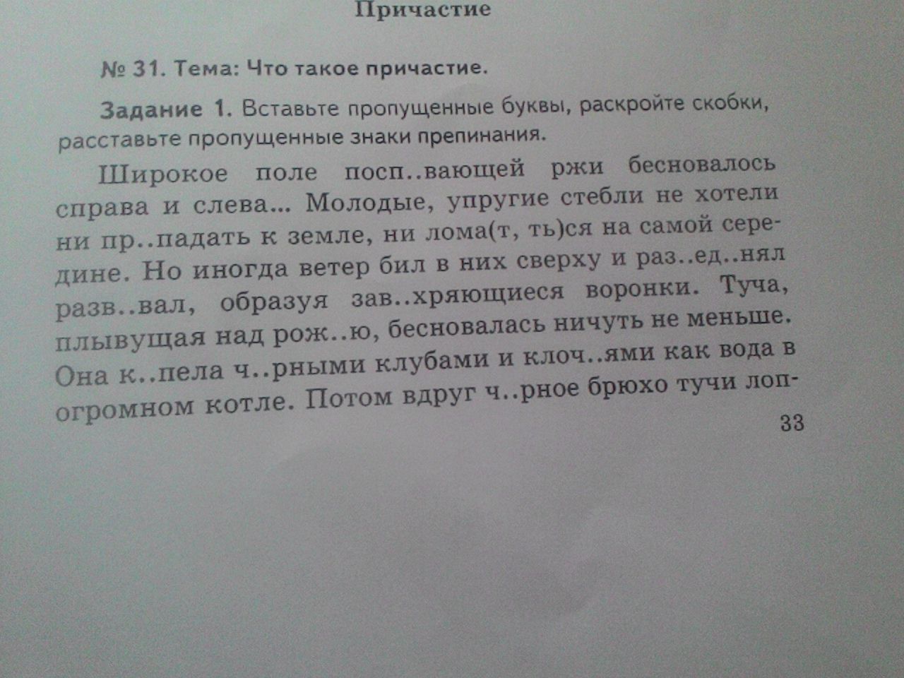 Широкое поле поспевающей ржи бесновалось справа и слева... Молодые, упругие стебли не хотели ни припадать к земле, ни ломаться на самой середине... Но иногда ветер бил в них сверху и разъединял, разрывал, образуя завихряющиеся воронки. Туча, плывущая над рожью, бесновалась ничуть не меньше. Она кипела черными клубами и клочьями, как вода в огромном котле. Потом вдруг чёрное брюхо тучи лоп...