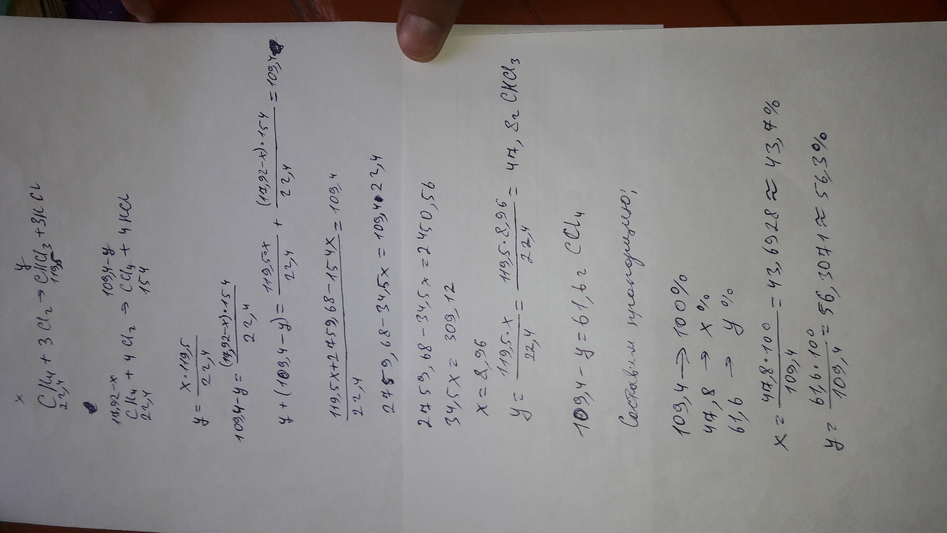 При хлорировании 17,92дм3 метана получено 109,4 г. смеси трихлорметана и тетрахлорметана . Найдите массовые доли продуктов хлорирования метана в их смеси.