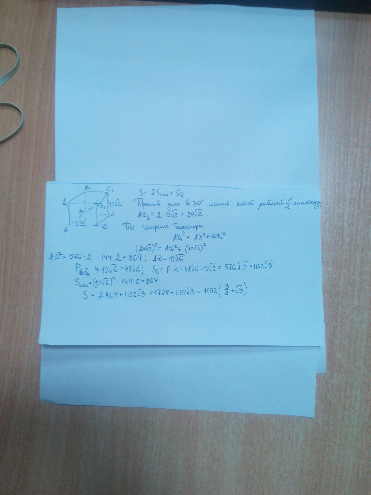 Диагональ правильной четырёхугольной призмы наклонена к плоскости основания под углом в 30о. Найдите площадь полной поверхности призмы, если высота этой призмы 12√2см