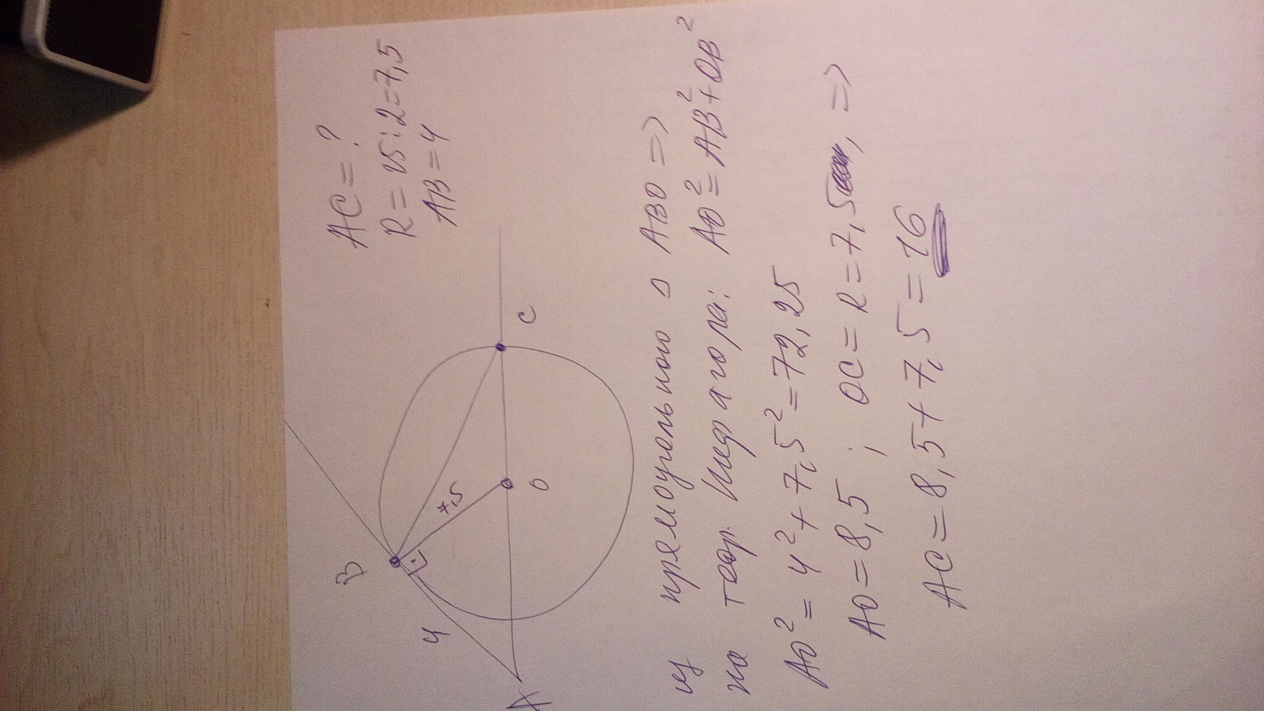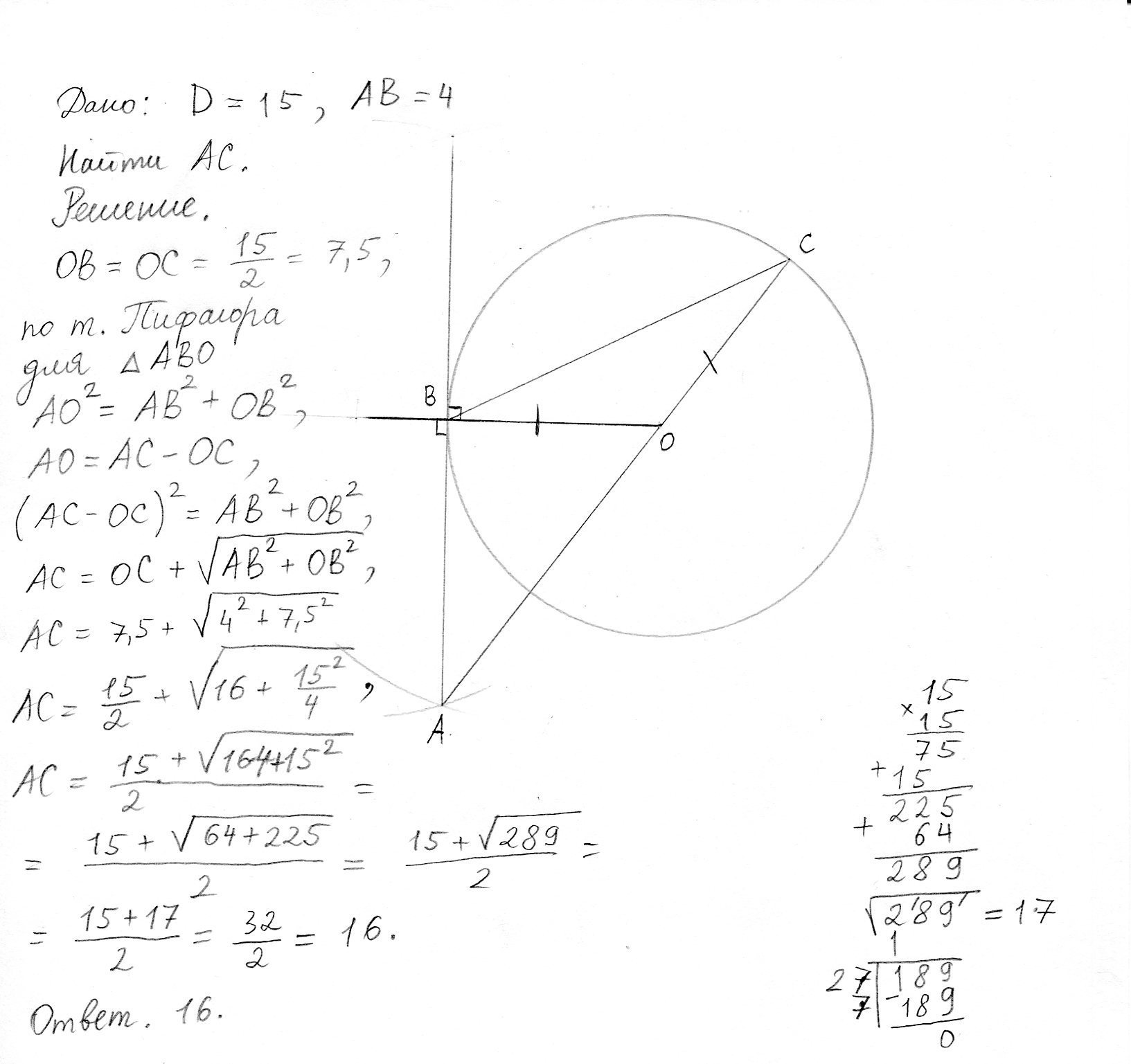 Окружность с центром на стороне АС треугольника ABC проходит через вершину С и касается прямой АВ в точке В. Найдите АС,если диаметр окружности равен 15, а АВ=4