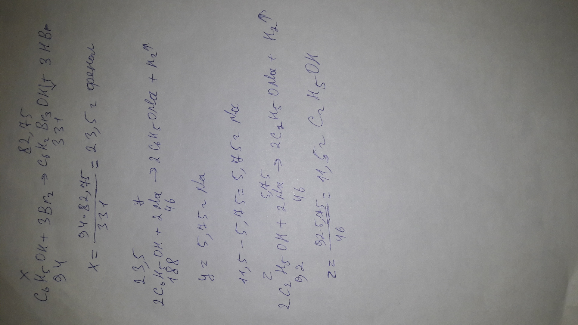 В результате взаимодействия смеси этилового спирта и фенола с избытком раствора брома в воде выделилось 82,75г осадка. Определите количественный состав исходной смеси, если такое же количество смеси может прореагировать с 11,5г натрия?