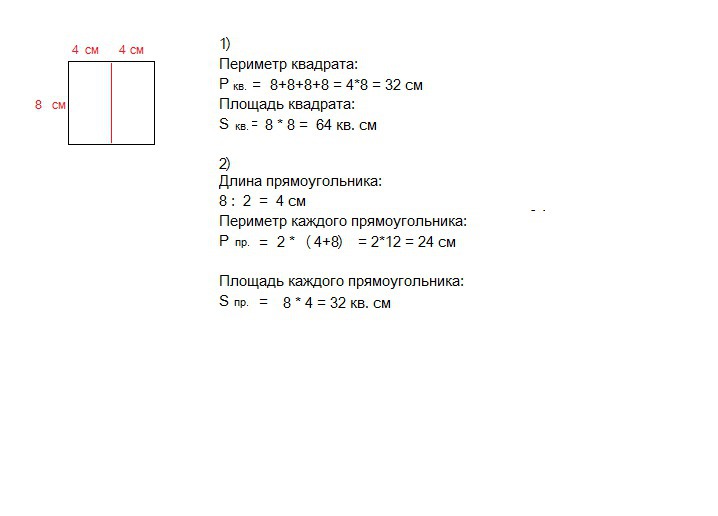 квадрат со стороной 8 см раздели одним отрезком на 2 равных прямоугольника . Найди:1) периметр и площадь квадрата;