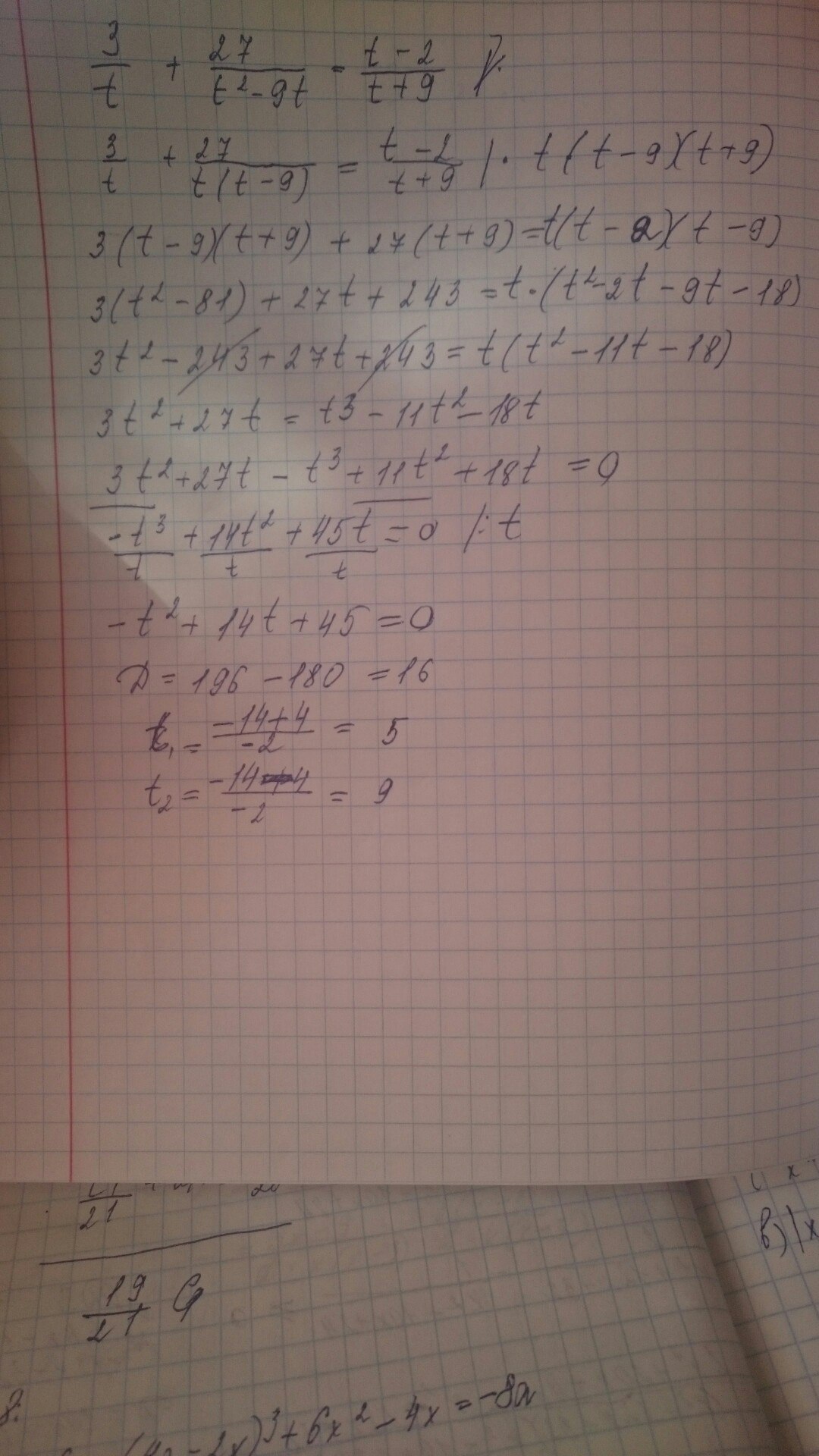 умножила все части уравнения на их знаменатели, а именно на t(t-9)(t+9), они сократились. Что не сократилось, пошло в числитель. Далее раскрытие скобок, приравнивание к нулю, приведение подобных. Остается стандартное квадратное уравнение, решаемое через теорему Виета или через дискриминант.