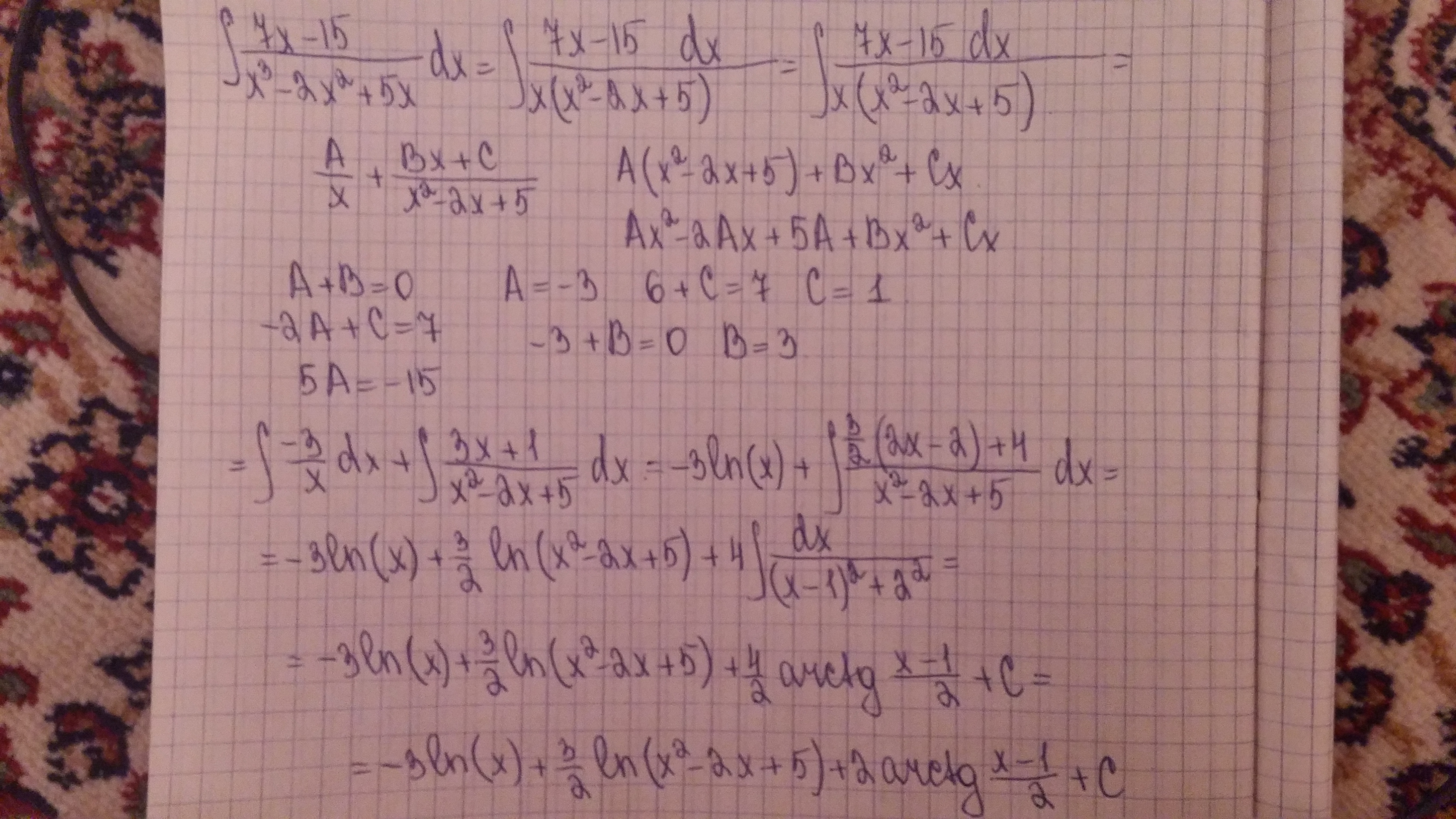 ответ: -3lnx+3/2ln(x^2-2x+5)+2arctg(x-1)/2+C