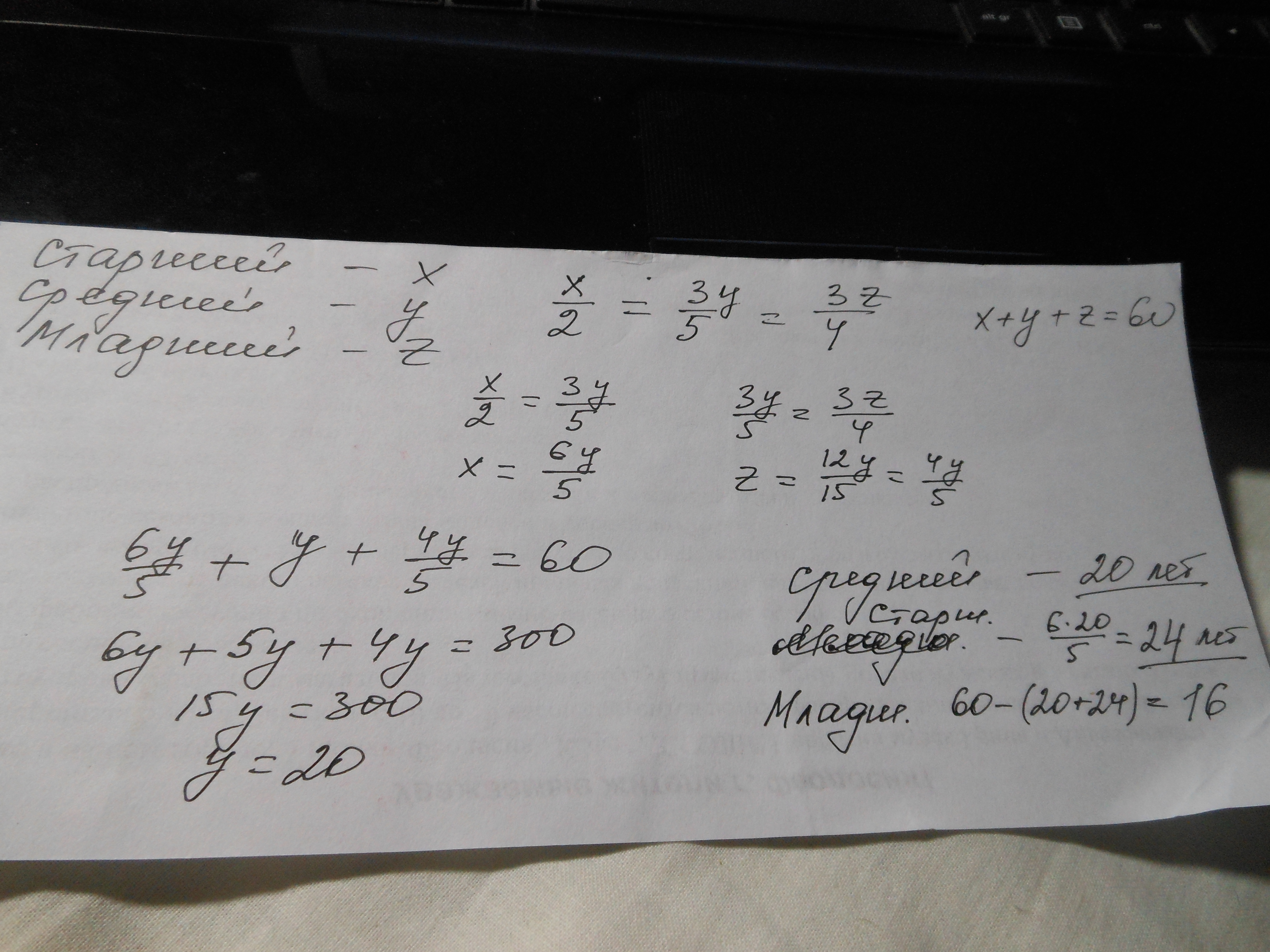 трём братьям вместе 60 лет. сколько лет каждому из них, если 3/4 возраста младшего брата, 3/5 возраста среднего брата и 50% возраста старшего брата выражаются одним и тем же числом ?