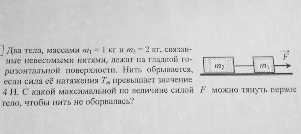 превышает значение 4Н. С какой максимальной по величине силой F можно тянуть первое тело, чтобы нить не оборвалась?