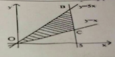 S=iint_{(OBC)} dx dy=int_0^5 dx int _x^{5x} dy = int_0^5( int _x^{5x} dy) dx =  int_0^5( y big|_x^{5x})  dx =\ \ = int_0^5( 5x-x)  dx =  int_0^5 4x  dx =(2x^2) big|_0^5=2*25 -2*0=50.