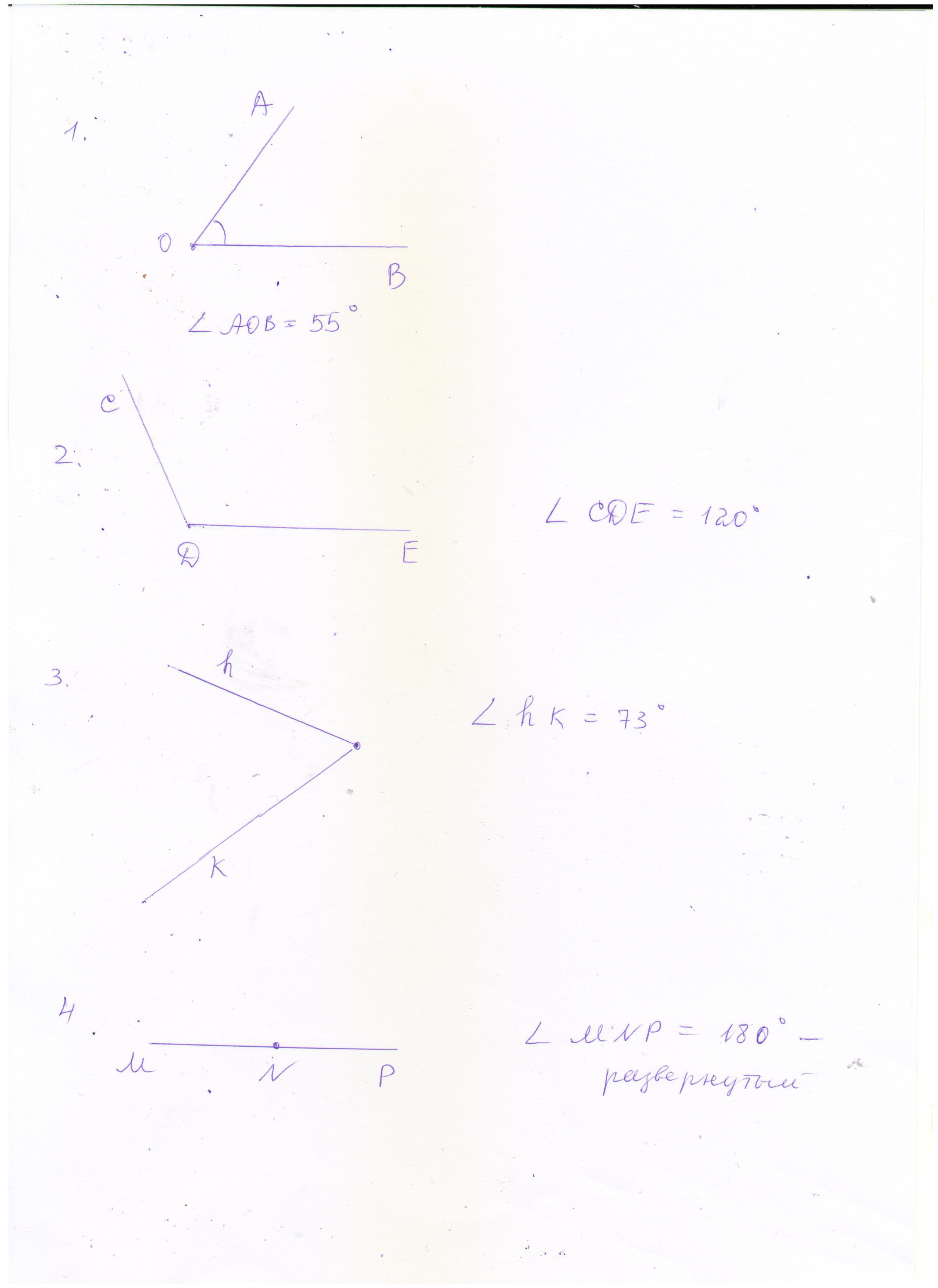 Начертите три неразвёрнутых угла и один развёрнутый угол и обозначьте их так : AOB,CDE,hk и MNP. С помощью транспортира измерьте углы и запишите результаты измерений.