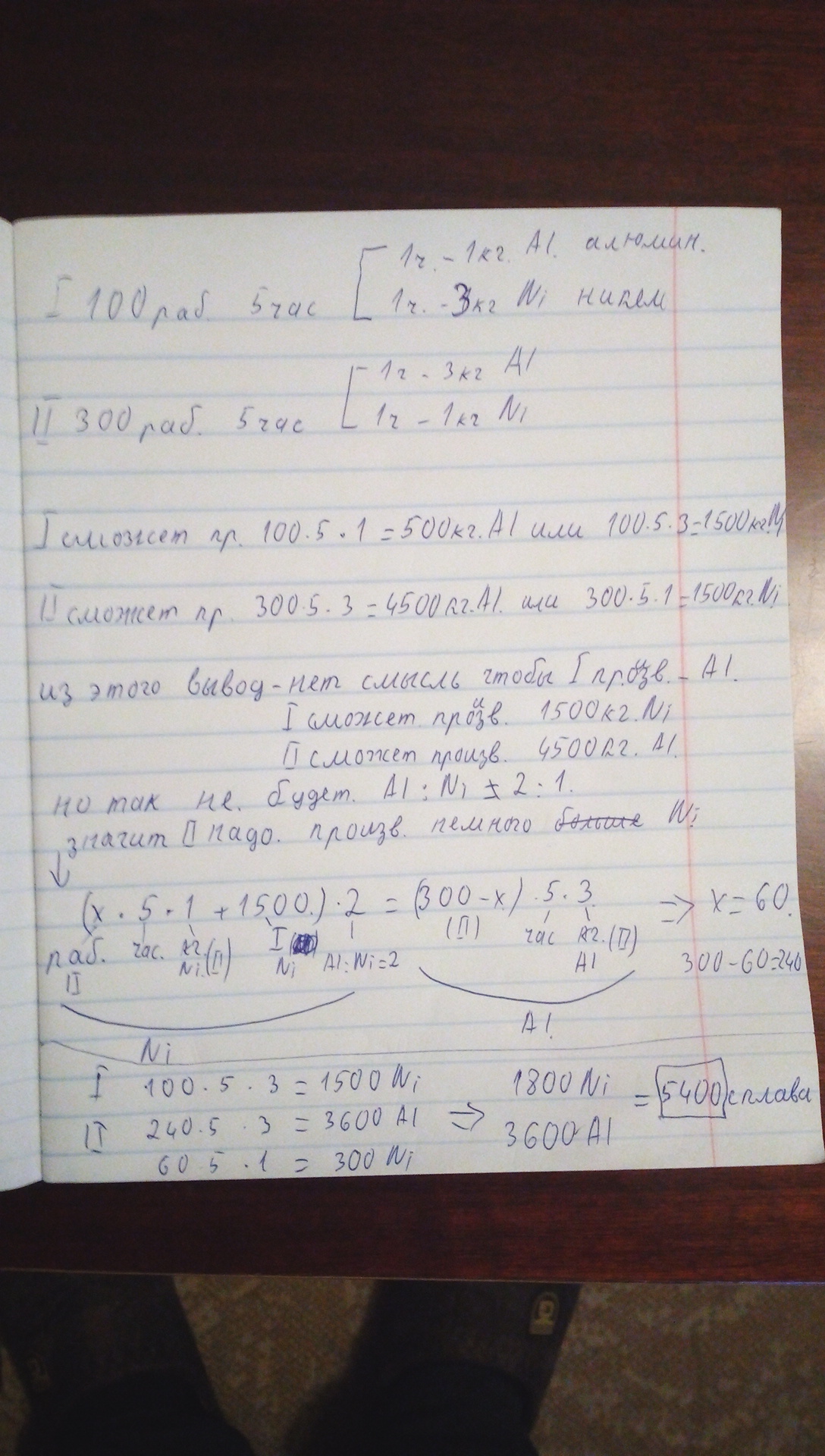 В двух шахтах добывают алюминий и никель. В первой шахте имеется 100 рабочих, каждый из которых готов трудиться 5 часов в день. При этом один рабочий за час добывает 1 кг алюминия или 3 кг никеля. Во второй шахте имеется 300 рабочих, каждый из которых готов 5 часов в день. При этом один рабочий за час добывает 3 кг алюминия или 1 кг никеля.