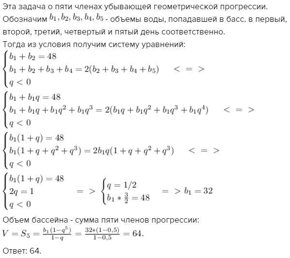Цистерну в течение пяти часов наполнили водой. При этом в каждый следующий час поступление воды в цистерну уменьшалось в одно и то же число раз по сравнению с предыдущим. Оказалось,что в первые четыре часа было налито воды вдвое больше, чем в последние четыре часа. Каков объем цистерны, если известно еще, что за первые 2 часа в нее было налито 48 м3 воды?