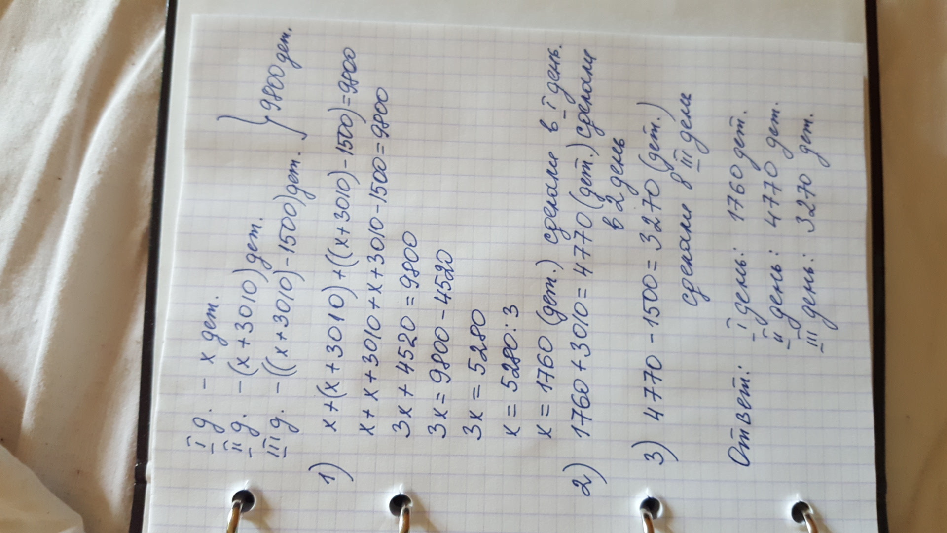 Во второй день сделали на 3010 деталей больше, чем в первый, а в третий на 1500 меньше, чем во второй день. Всего за три дня сделали 9800 деталей. Сколько сделали в каждый день?