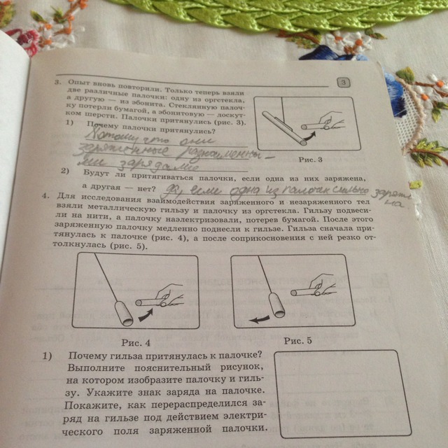 Гильза не имела заряда, палочка зарядилась положительно вследствие трения о бумагу. Гильза притянулась, произошло перераспределение электронов, и гильза получила от палочки положительный заряд. Далее гильза оттолкнулась от палочки, ибо они имели одинаковый заряд.