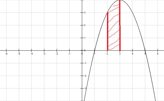 Графиком является порабола ,ветками вниз,т.к. -х²,с корнями 1и5,ветки пораболы пересекают ось ох в точках х1=1их2=5,в точках х=2 и х=3 провести вертикальные прямые,получаем криволинейную трапецию,