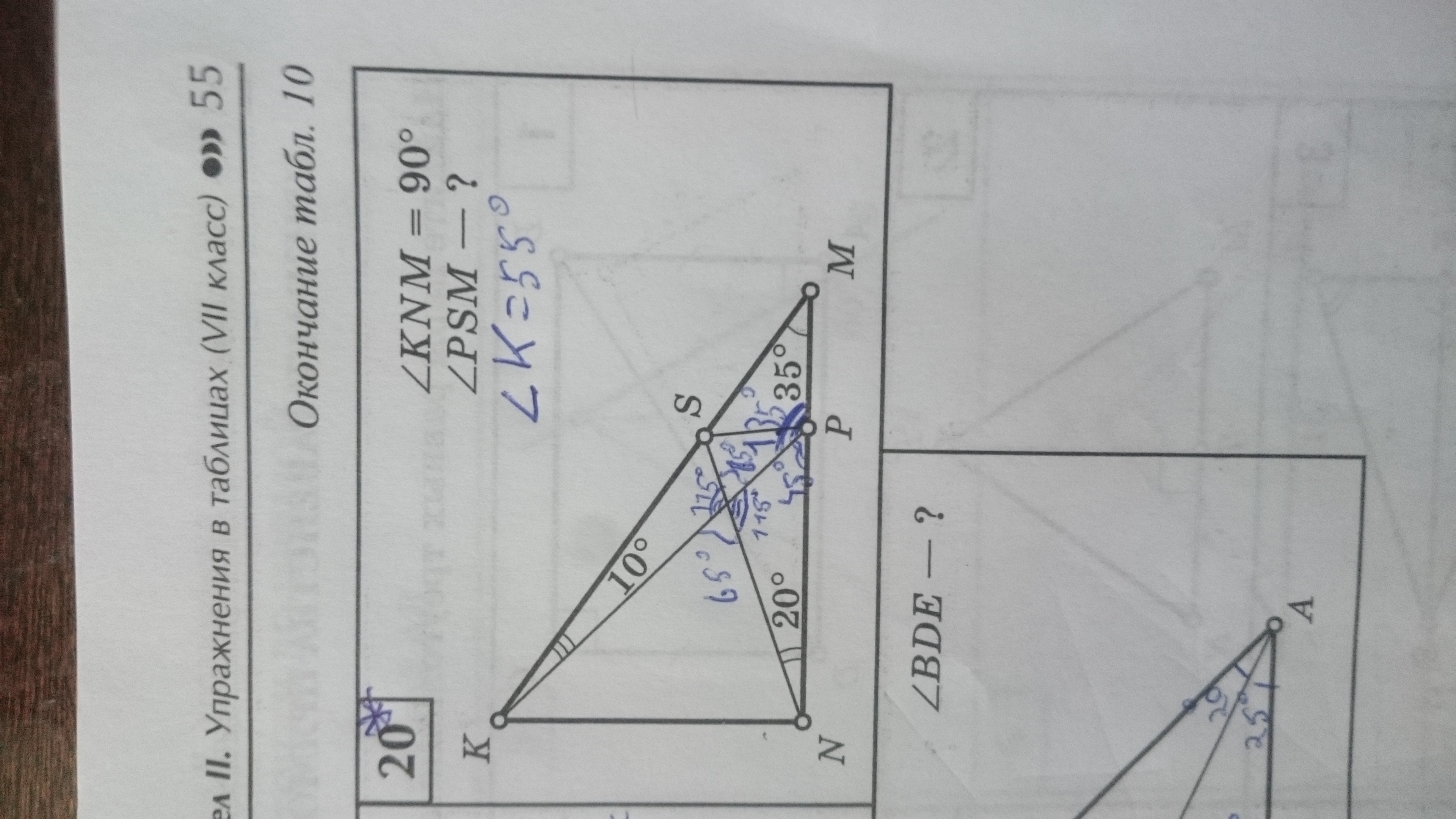 Аналогично, ∠PKN=55°-10°=45°, ∠KPN=90°-∠PKN=90°-45°=45°.