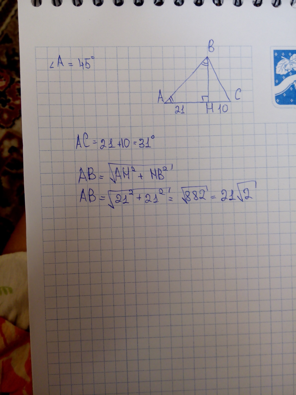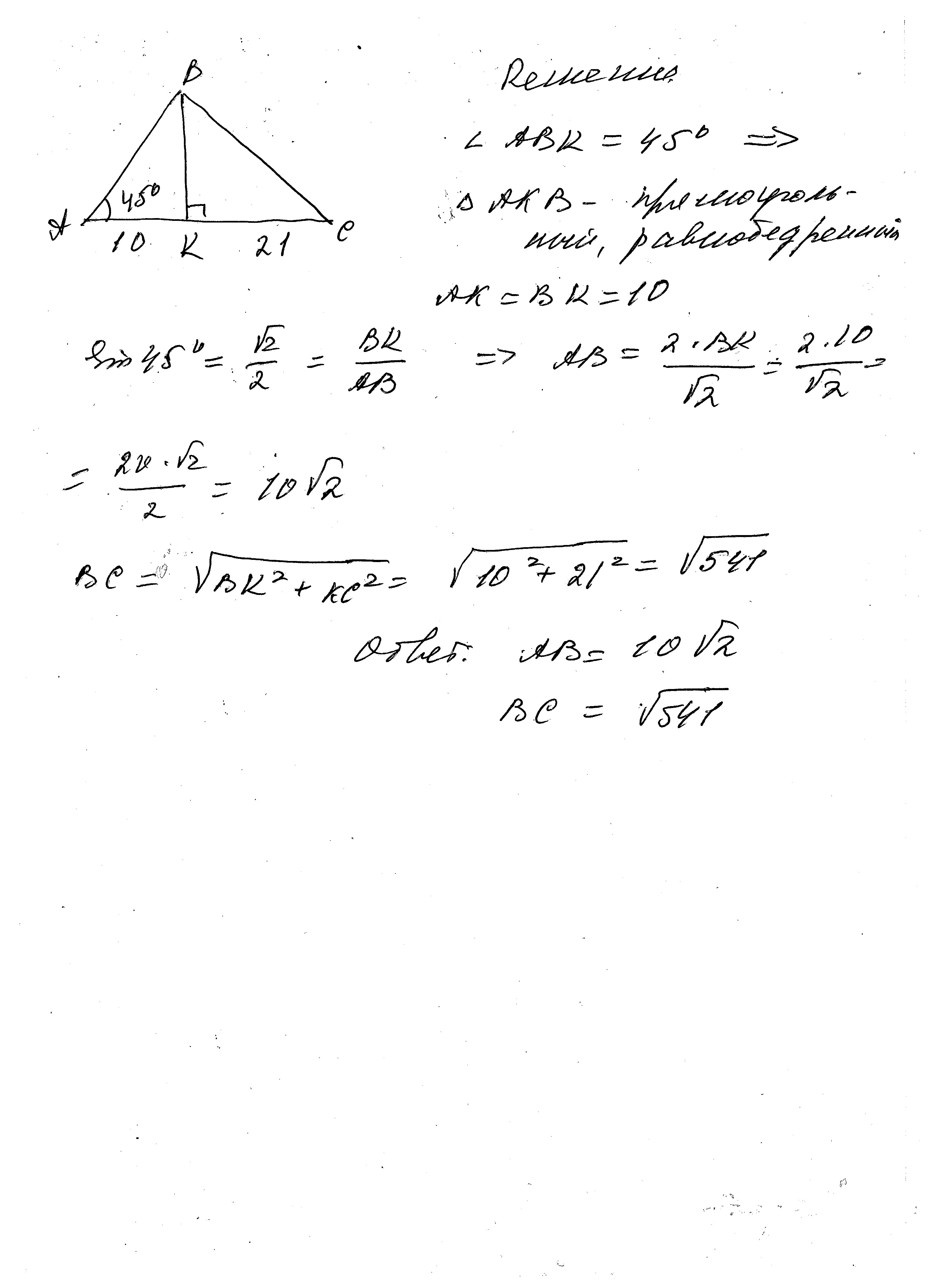 В треугольнике ABC, угол A=45 градусов, из вершины B проведена высота которая делит AC на отрезки 10 и 21 см. Найти стороны AB и AC.
