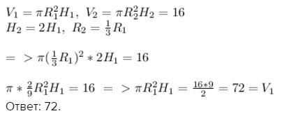 Найдите объем первого цилиндра, если его высота в два раза меньше, а радиус основания в три раза больше, чем у второго цилиндра, причем объем второго цилиндра равен 16.