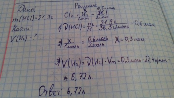 При взаимодействии хлора с водородом образовалось 21.9 хлороводорода.Вычислите объем водорода, вступившего в реакцию (н.у.). Cl2+H2=HCl в реакции необходим о расставить коэффициенты.
