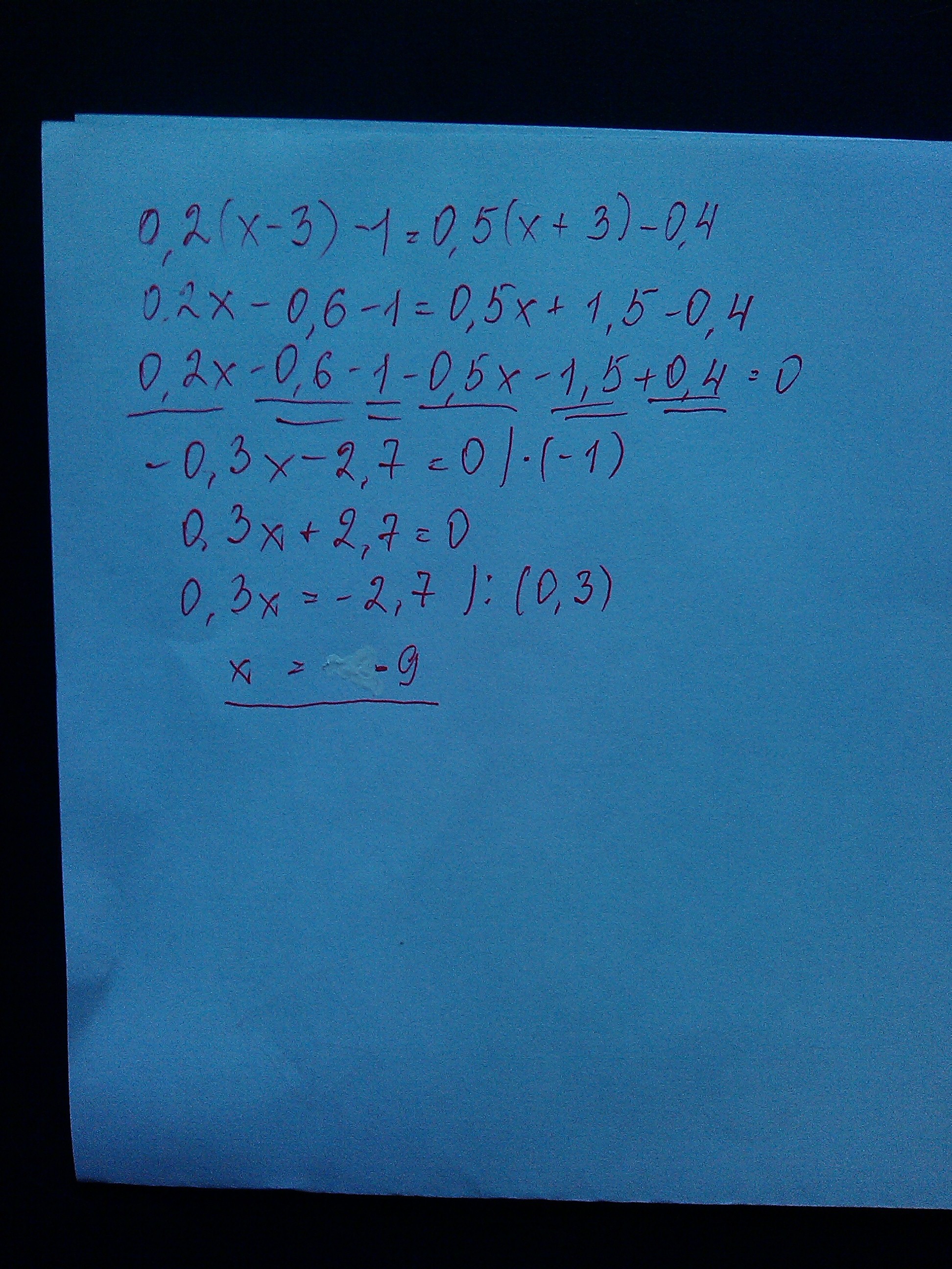 0,2(х-3)-1 = 0,5(х+3)-0,4