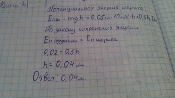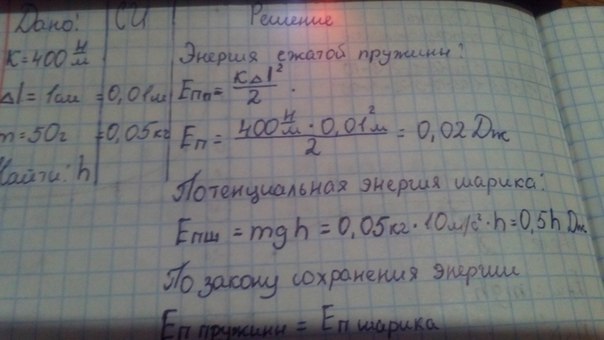 Пружинный пистолет с пружиной жесткостью 400 Н/м, сжатой на 1 см, выбрасывает вертикально вверх шарик массой 50 г. На какую высоту поднимется шарик?
