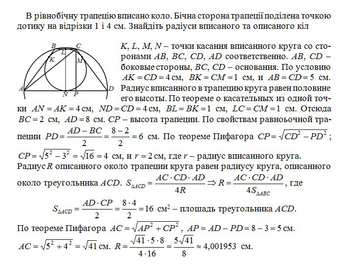 В рівнобічну трапецію вписано коло. Бічна сторона трапеції поділена точкою дотику на відрізки 1 і 4 см. Знайдіть радіуси вписаного та описаного кіл трапеції