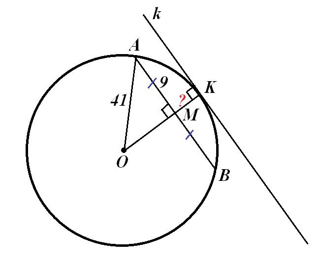 Радиус окружности с центром в точке О равен 41 длина хорды a b равна 18.Найдите расстояние от хорды AB до параллельной ей касательной K.
