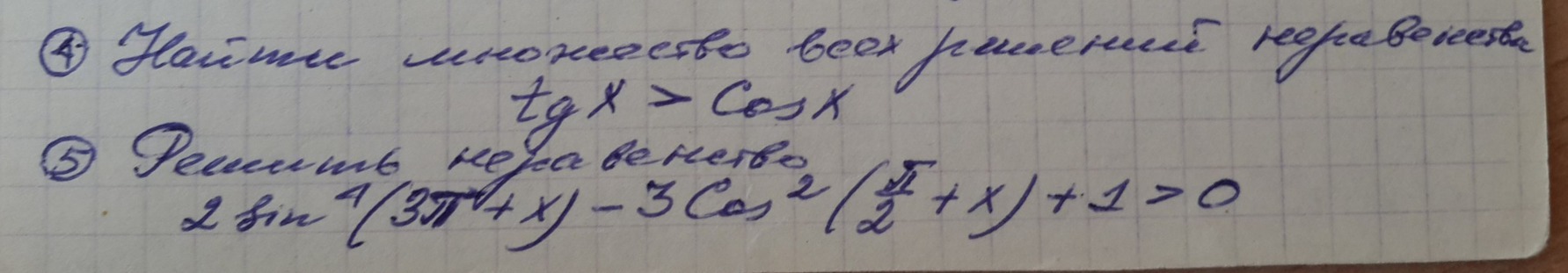Решила графически.Построила тангенсоиду и косинусоиду.Нашла на каких промежутках грaфик у=tgx выше,чем y=cosx