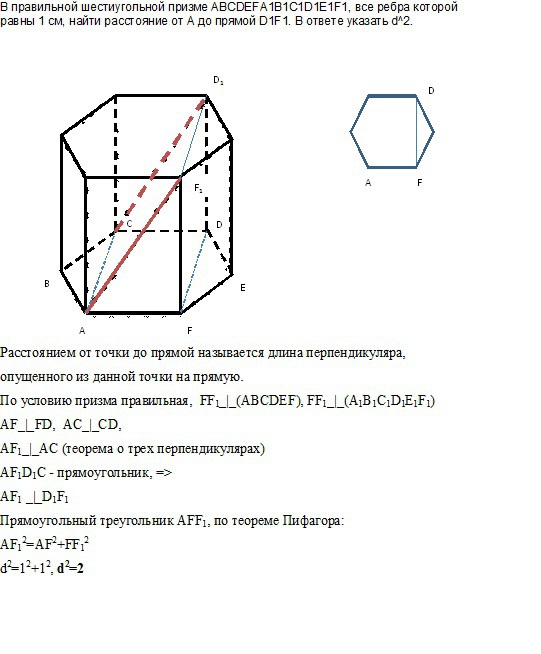 В правильной шестиугольной призме ABCDEFA1B1C1D1E1F1, все ребра которой равны 1 см, найти расстояние от А до прямой D1F1. В ответе указать d^2.