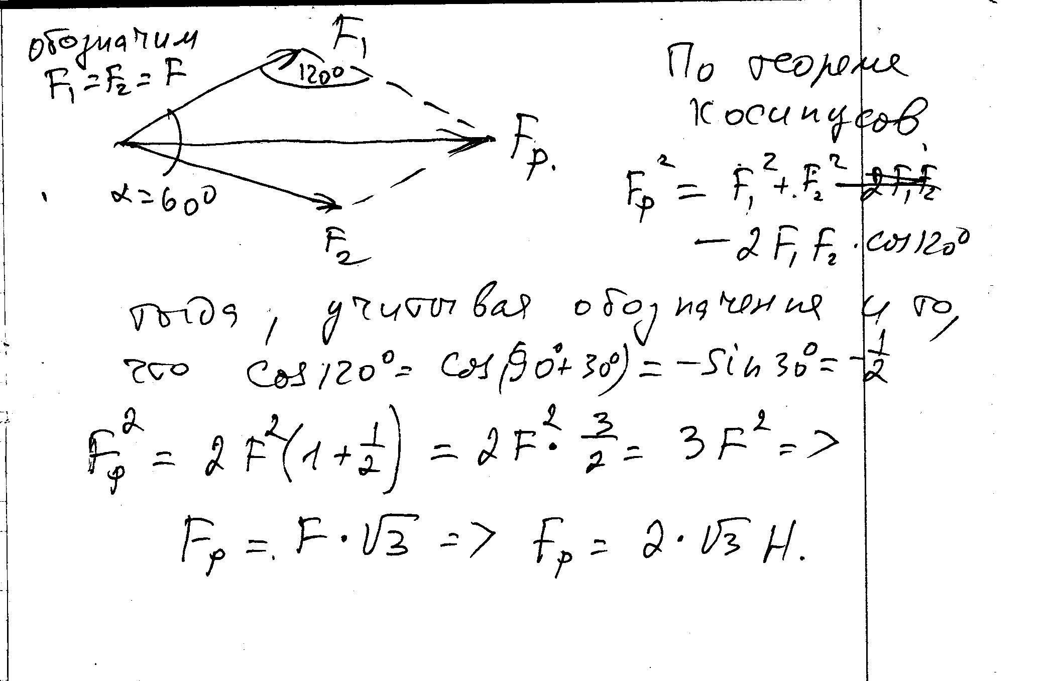 на материальную точку действуют две силы F1=2Н и F2=2Н, направленные под углом 60град. друг к другу. Равнодействующая двух сил равна?