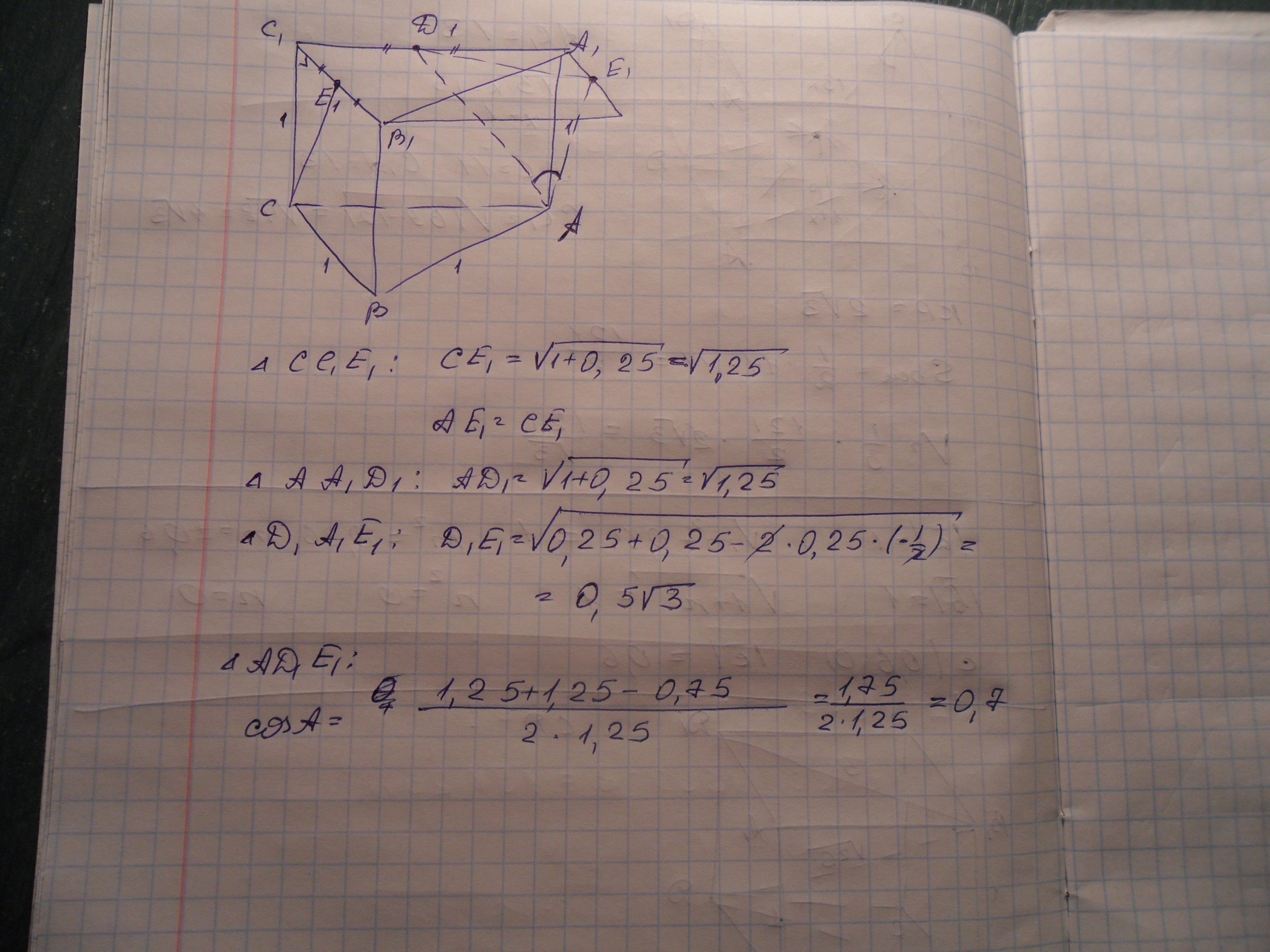 В правильной треугольной призме ABCA1B1C1, все ребра которой равны единице, найти косинус угла между прямыми AD1 и CE1, где D1 и E1 соответственно середины ребр A1C1 и B1C1.