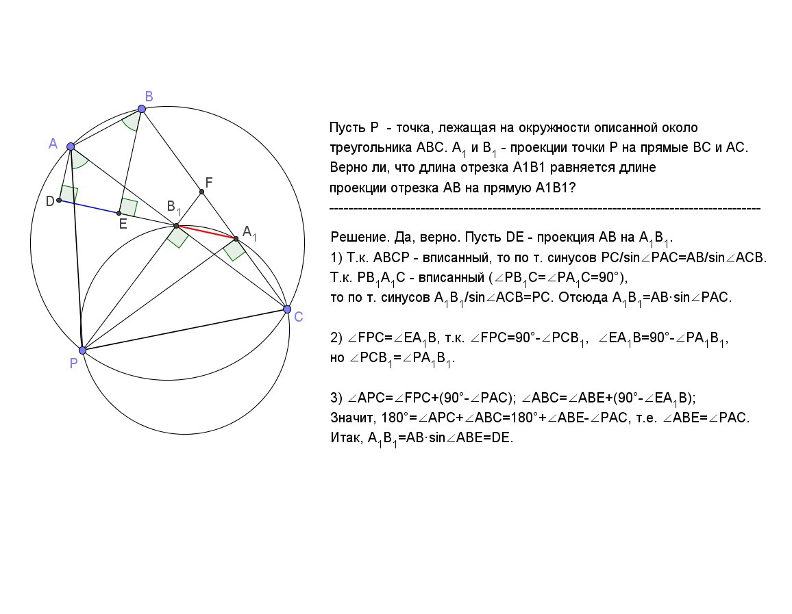 Пусть А1 и В1 - проекции точки Р описанного круга треугольника АВС на прямые ВС и АС. Верно ли, что длинна отрезка А1В1 равняется длине проекции отрезка АВ на прямую А1В1?