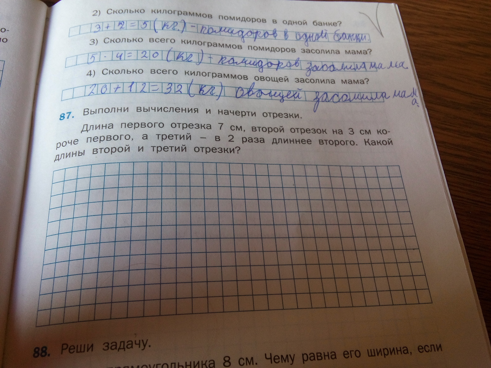 длина первого отрезка 7 см, второй отрезок на 3 см короче первого, а третий - в 2 раза дленее второго. Какой длены второй и третей отрезки?