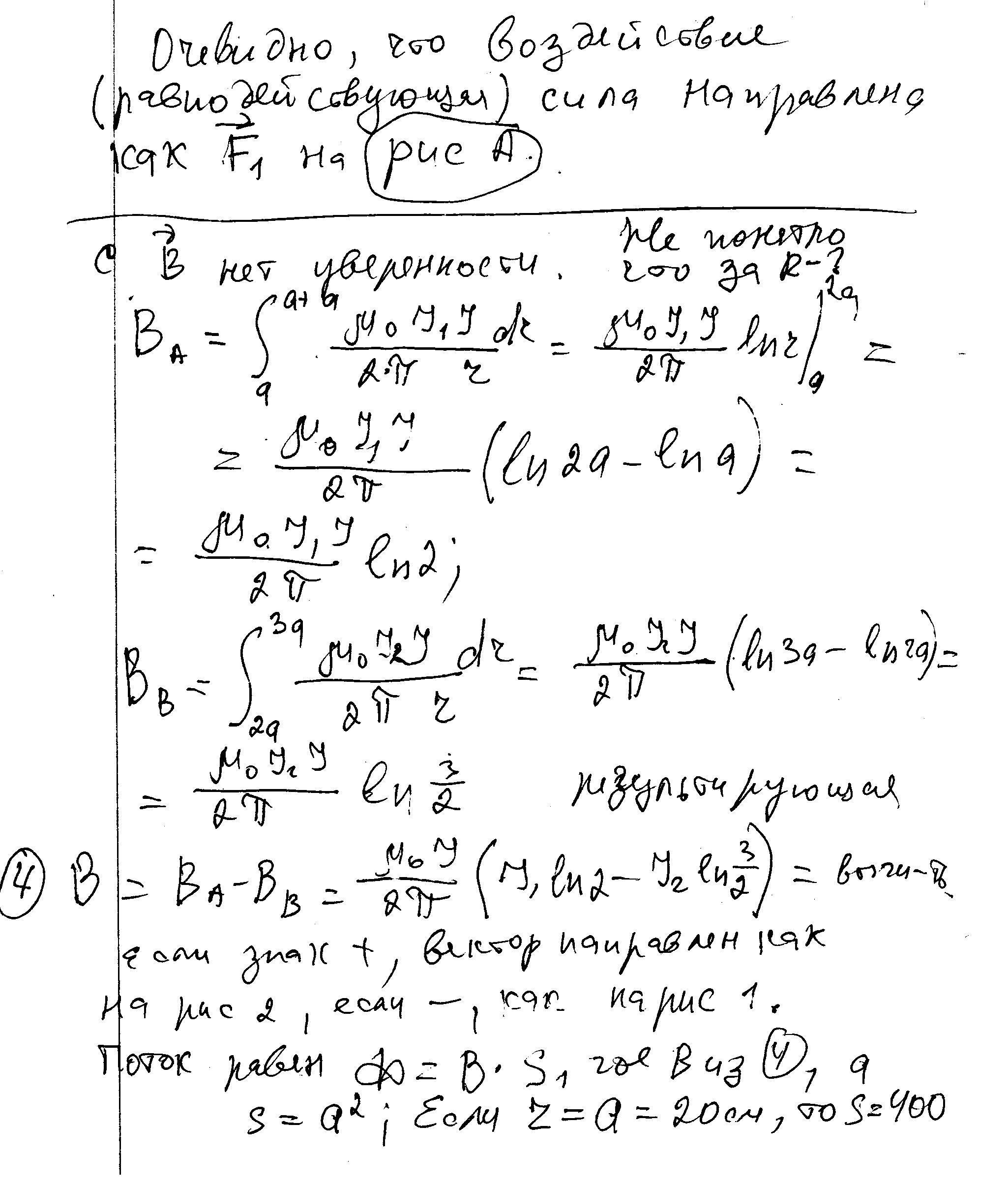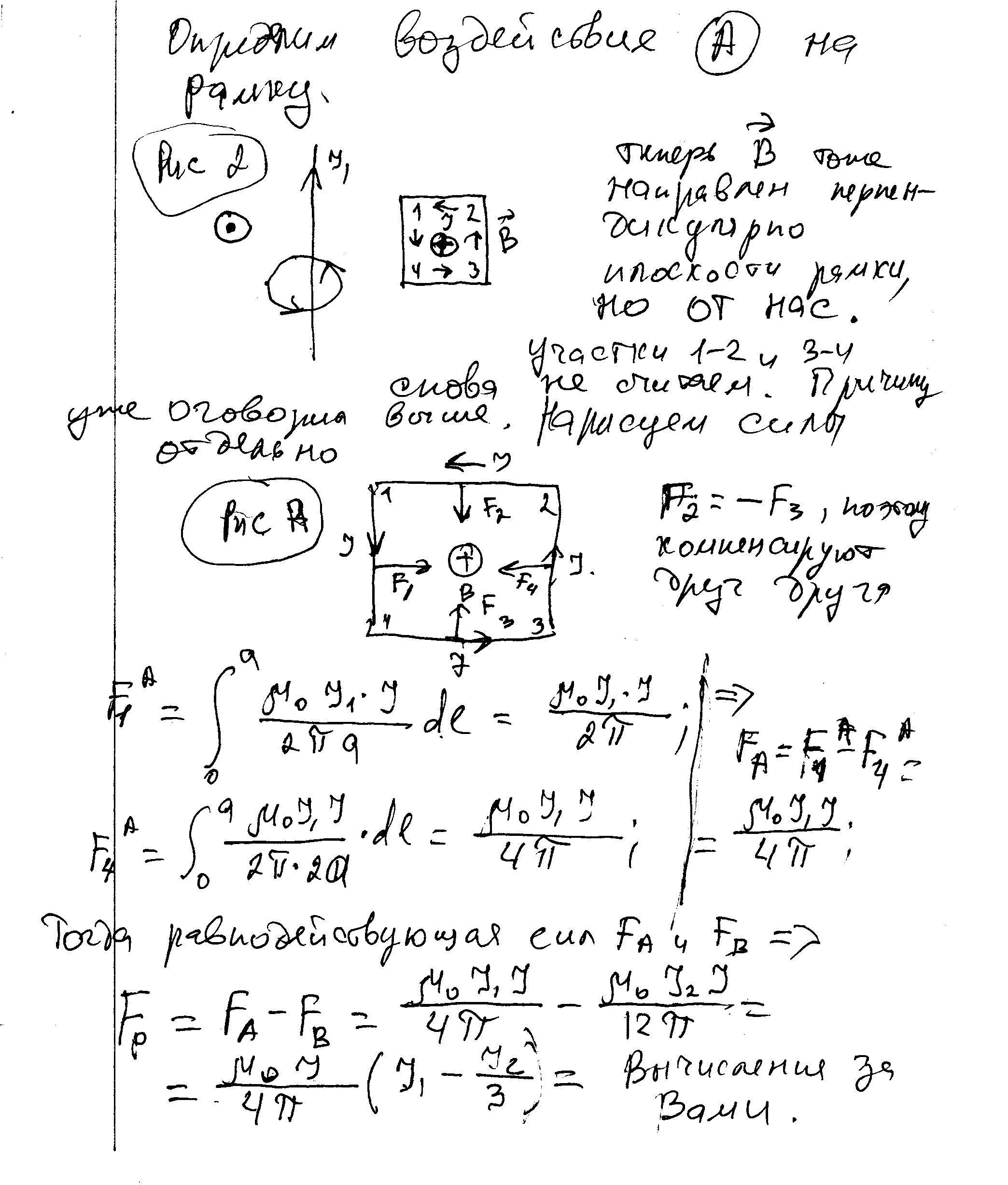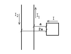 В плоскости расположены два бесконечных прямых проводника с токами I1=20А и I2=40А квадратная рамка с током I=20А.