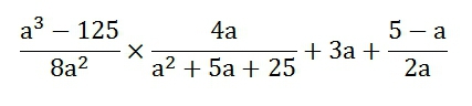 а^3-125=(а-5)(а^2+5а+25)(разность кубов). Первая дробь получается такая:(а-5)(а^2+5а+25)/8а^2. а^2+5а+25 есть в обеих дробях,=> оно взаимно уничтожается. Сокращаются 8а^2 и 4а. Остаётся: а-5/2а(первая дробь)+3а(вторая)+5-а/2а(третья). 3а домножим на 2а, чтобы привести к общему знаменателю. Складываем это всё, получаем дробь:а-5+6а^2+5-a/2а. Приводим подобные. Получается дробь: 6а^2/2а=3а