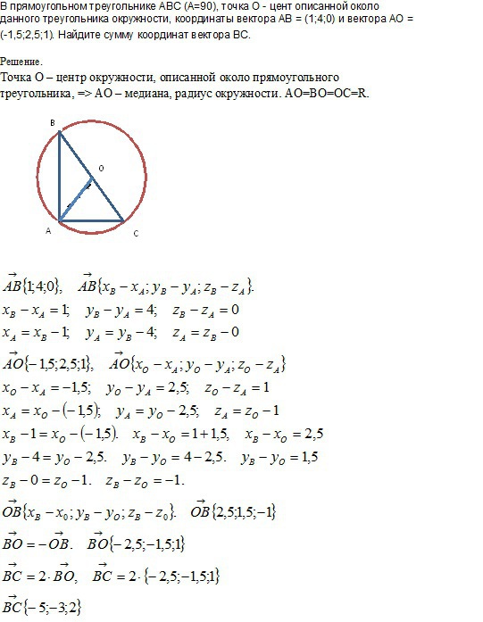 В прямоугольном треугольнике ABC (A=90), точка O - цент описанной около данного треугольника окружности, координаты вектора AB = (1;4;0) и вектора AO = (-1,5;2,5;1). Найдите сумму координат вектора BC.