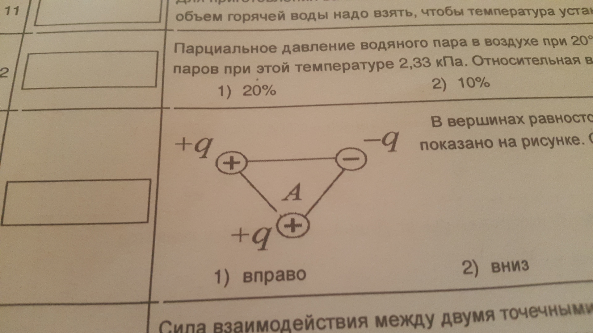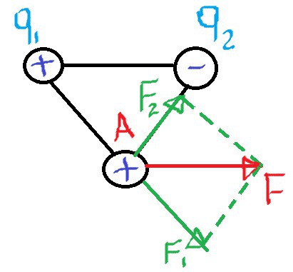 В вершинах равностороннего треугольника расположены заряды так как показано на рисунке. Сила, действующая на зарядке в точке А, направлена :