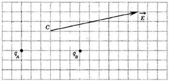 На рисунке изображен вектор напряженности электрического поля в точке С; поле создано двумя точечными зарядами qA и qB. Чему примерно равен заряд qB, если заряд qA равен +2 мкКл? Ответ выразите в микрокулонах (мкКл).